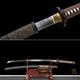 The Blade is Damascus steel Full Tang Blade, saya (scabbard) is solid wood rosewood, yellow theme tsuba, rosewood handle