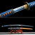 High manganese steel Full Tang Blade blue, saya (scabbard) solid wood material, yellow theme tsuba, white ray-skin wrap, blue cord handle