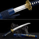 1045 Carbon Steel blade, Bue scabbard, blue cord handle with white ray-skin wrap.